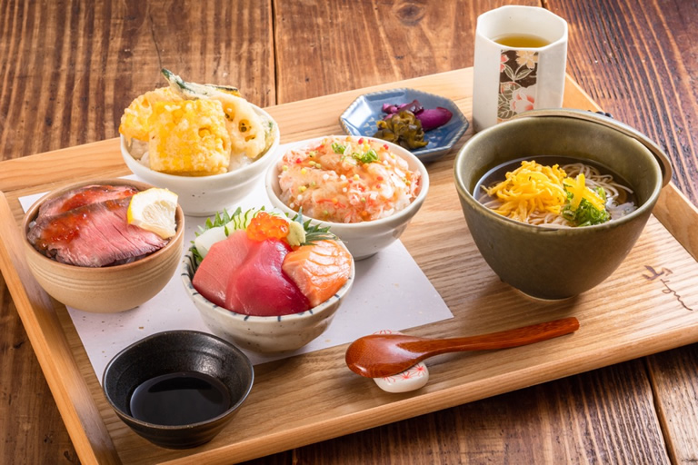 カニあんかけ丼、海鮮丼、和牛ローストビーフ丼、天婦羅丼と、4つの丼が食べ比べできるお得な内容で、見た目も可愛い。※丼の内容は季節によって変わります。