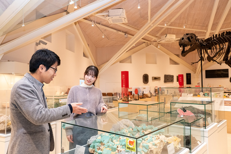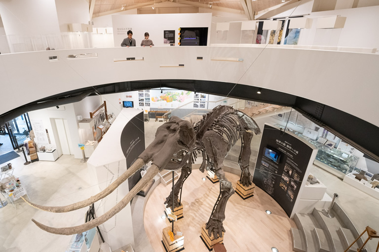 エントランスを抜けると出迎えてくれるのが、全長7.6mの大迫力のステゴドン(昔のゾウ)。館内には、玄武岩をはじめ、世界の鉱物・宝石・奇石・化石など2500点以上が展示されています。