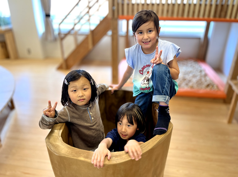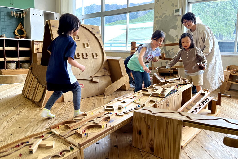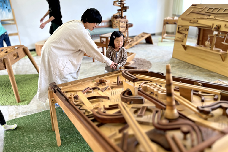 皆で一緒に遊んだり、一人で黙々と知育玩具に取り組んでいたり、子どもたちは撮影中も木のおもちゃに夢中。