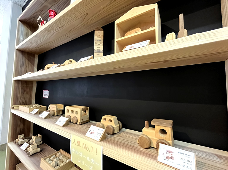 入口近くでは、木のおもちゃが展示販売されているほか、木製のインテリア小物などを販売するショップもあります。