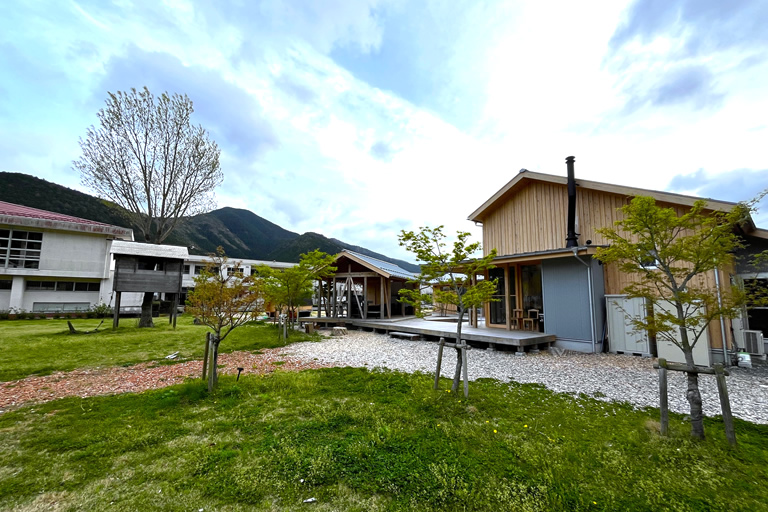 2023年4月、校庭に1日1組限定の一棟貸しの宿・ウッドヴィラも誕生。