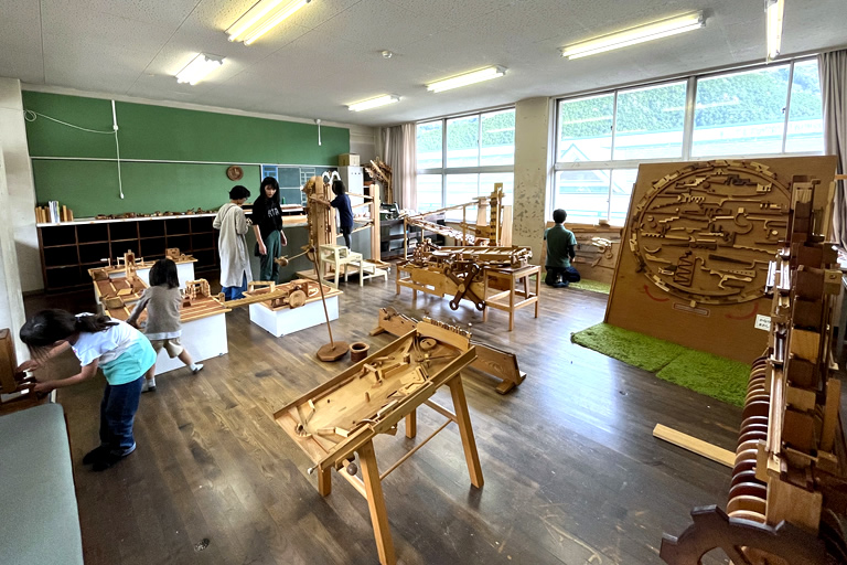 教室3つ分と廊下を使ったスペースに、木のおもちゃがいっぱい並んでいます。
