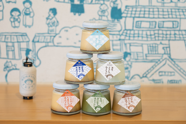 昨年7月にオープンしたプリン専門店で、ナチュラルモダンなインテリアに和のテイストを取り入れた、ブルーの刺し色が可愛い内観のお店です。「もしも江戸時代の姫路城下町にプリン屋さんがあったら」がコンセプト。壁に書かれたイラストや手土産用のパッケージもカワイイですよ。