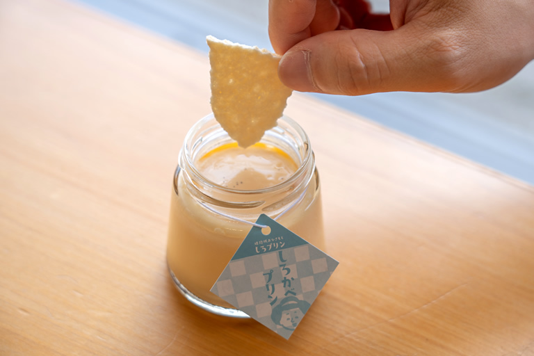 ダントツ人気は「しろかべプリン」。なめらかで濃厚な味わいが特徴です。姫路城の真っ白な壁に見立てたメレンゲクッキーがついてきます。はじめはそのままで、途中からメレンゲを入れてザクザクとろりな食感を楽しんでみてね。