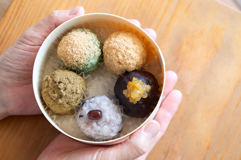 一口サイズのおはぎをわっぱに入れた「まんまる和菓子の詰め合わせ」1,172円(税込)がお土産におすすめ!おはぎの種類は季節によって変わります。懐かしいのに新しくて可愛い、もらったらうれしくてニンマリしてしまいそう。
