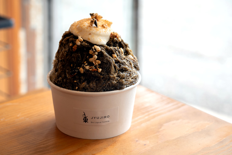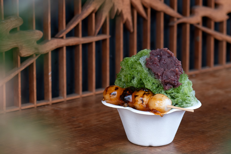 夏季限定(7月中旬~9月中旬予定)のかき氷(650円(税込))も提供中。みたらし団子(130円(税込))と姫路産の小豆(100円(税込))を追加トッピングしてもらいました。火照ったからだを冷ましたり、お腹も満たしたいときに最高の組み合わせです。