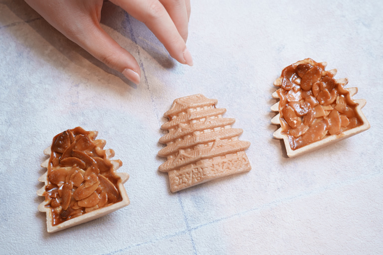 創業60年の「五層もなか本舗」の「キャッスルフロランタン」(1個162円(税込))は、ひと目で姫路のお土産とわかるオススメのお菓子。定番の姫路銘菓「五層もなか」のもなか皮がフロランタン風にアレンジされています。サクサクの食感になるように、アーモンドの量や焼き加減にこだわり、一枚一枚オーブンで手焼きしているのだそう。