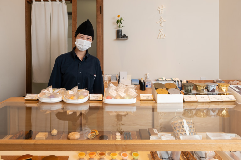 「甘音屋」は洗練された魅力的な商品で、和菓子好きだけでなく、洋菓子派もファンが多い和菓子屋さん。市内にカフェを含む3店舗を展開しており、手土産にぴったりの商品が販売されています。