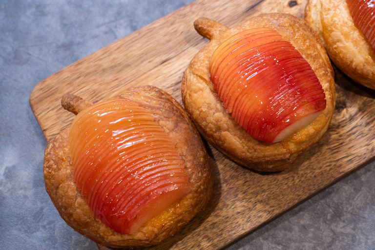 りんごは甘酸っぱくて煮崩れしにくい青森の紅玉を使用。手作りのりんごジャム、カスタード、りんごのタルトタタンの三層仕立て。手切りならではのシャクシャクとしたりんごの歯ごたえが味わえるんです。