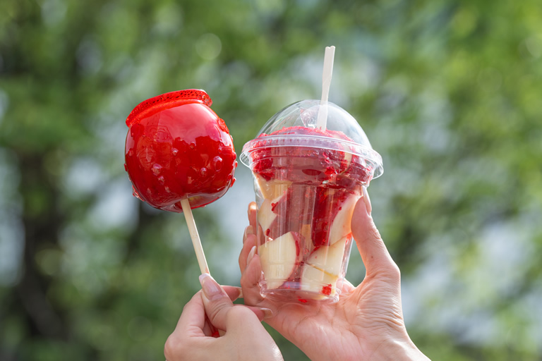 こちらの「りんご飴」(520円(税込))は、季節によってりんごの種類が変わるためリピーターが多い商品だそうです。食べ歩きする場合は、プラス50円でその場でカットしてもらうのがおすすめです。ジューシーなりんごとパリパリの飴のバランスが絶妙で、「ここのりんご飴でないとダメ!」と言う人も。