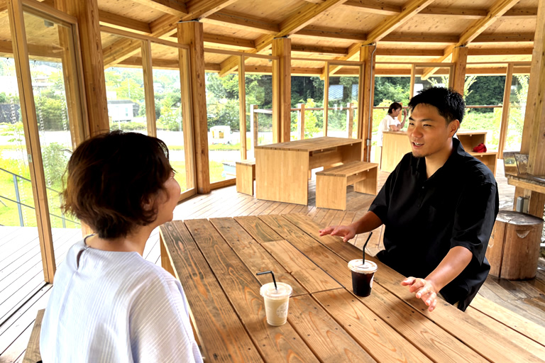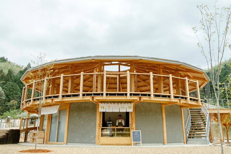 敷地の中心にある木造2階建ての円形建物内には、直売所やカフェがあり、2階は自由に使える休憩スペースもあります。