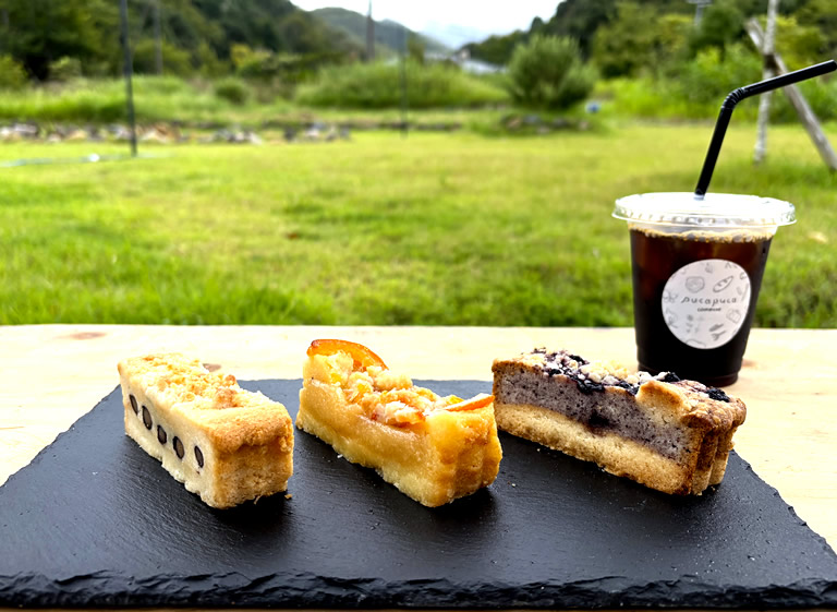 ▲ スティックケーキ(黒豆・オレンジ・ショコラ)各380円と丹波篠山マグナムコーヒーのドリップコーヒー420円