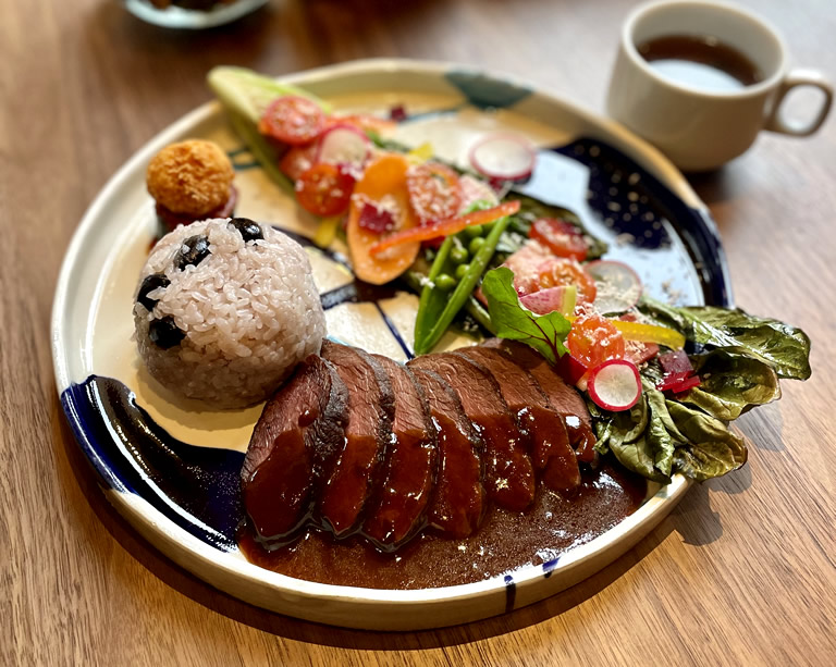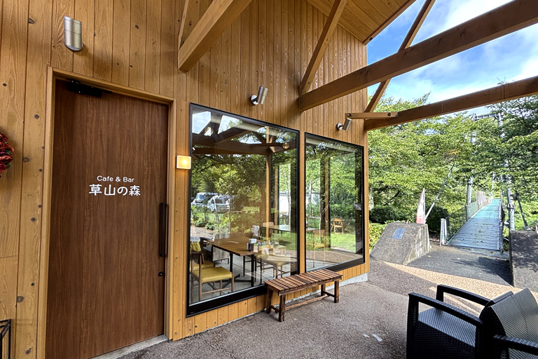 敷地内にはホテル、温泉、お食事処のほか、2022年にグランピング施設、2023年に「cafe&bar 草山の森」も誕生。緑に包まれたカフェは吊り橋のすぐそばというロケーション。カフェのメニューには、猪肉、鹿肉を使ったワンプレートランチから、丹波栗や黒豆を使ったスイーツまで揃っています。