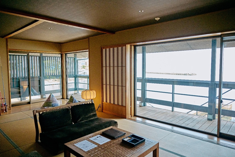 1室しかなくて大人気だそうなので予約は困難ですが、プライベートデッキが設置されていて、そこで釣りができます。プライベート桟橋で朝も夜も釣り三昧で、釣った魚はプロに加工・調理してもらえて、海の様子を眺めながらいつでも自由に温泉に浸かれます。初心者はもちろん、釣り好きにも堪らないはず‼