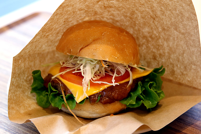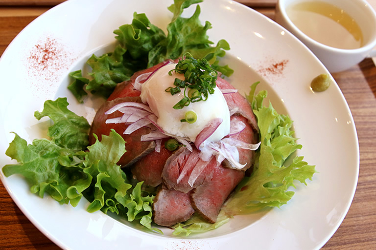 新メニューの「但馬牛100%のハンバーガー」1,200円と「但馬牛100%ローストビーフ丼」1,600円がオススメ!旨みたっぷりの柔らかく甘みのある但馬牛が味わえます。