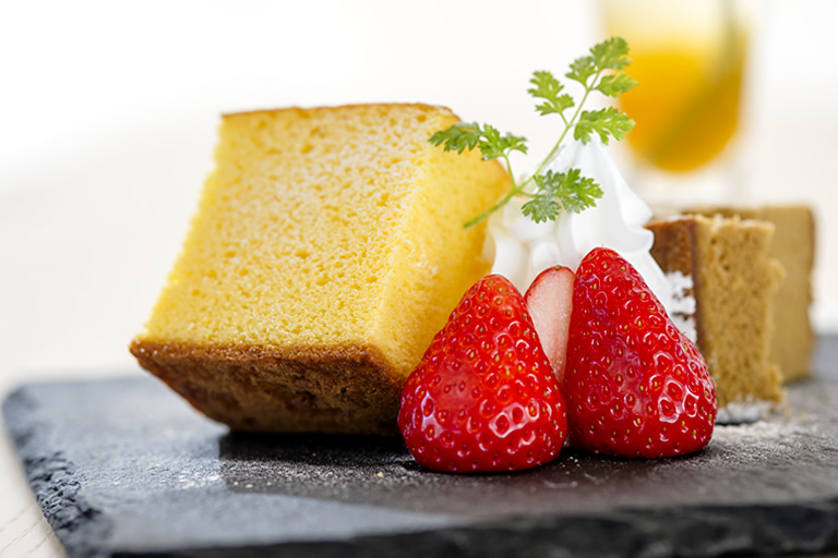 また、菓子工房も併設されていて、看板商品の「ミルクカステラ」は、地産品のヒラヤミルクと岡ちゃんたまごを使用。サクサクのザラメとしっとりした食感が絶妙です。カフェで食べることもできるし、お土産で購入することもできます。