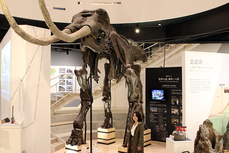 1Fで出迎えてくれるのは、全長7.6mの大きなアジアゾウ。山陰海岸で昔のゾウの足跡が多数発見されていることにちなんで展示されているんですが、すごく迫力がありますよ。足の間から見上げたり、2階から見下ろしたりもできます。