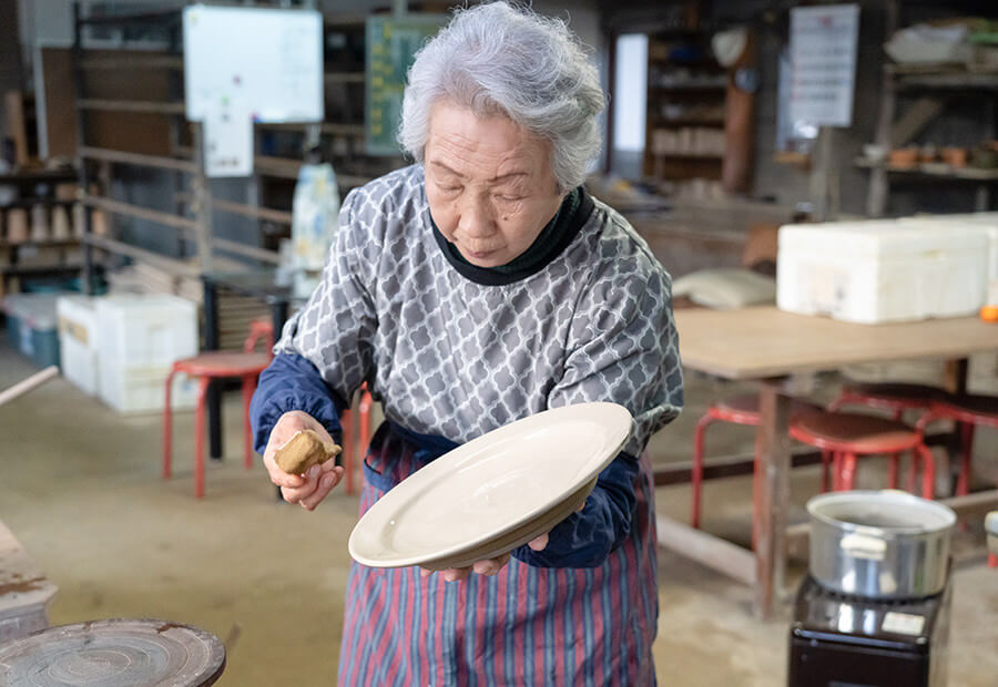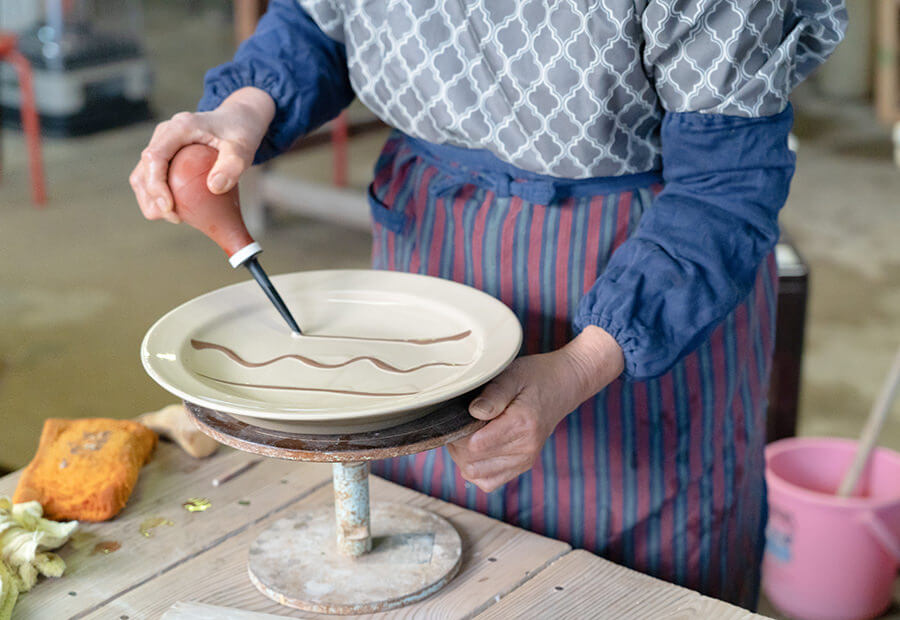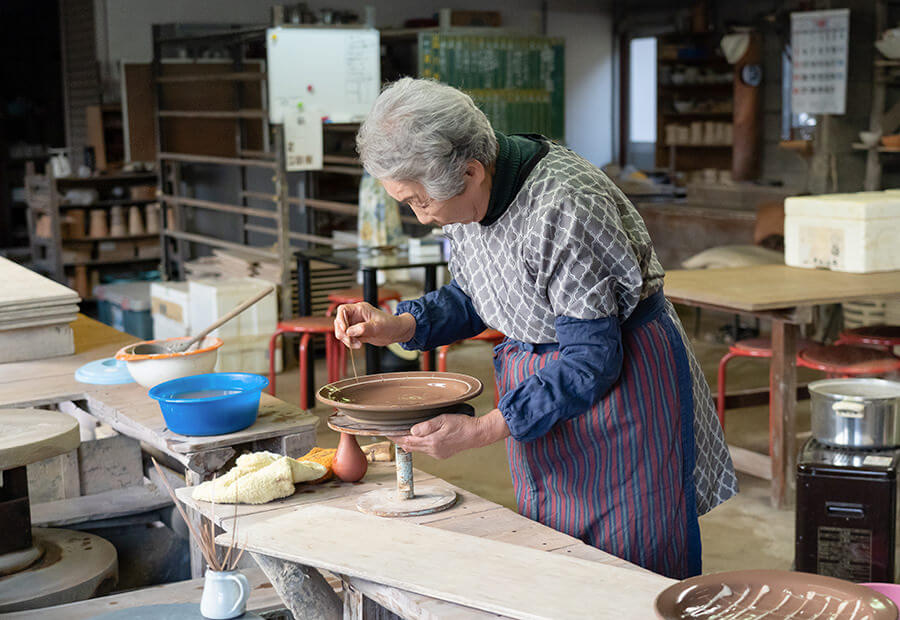この10年は、茂子さんの娘である公子さんが京都から通い、「丹窓窯」を継ぐべく勉強中。最初は窯を継ぐという意識はあまりなかったそうですが、生前に直接手ほどきを受けた父・茂良さんの教えや、今も一番近くで学んでいる母・茂子さんのスリップを見つめる中で、“「丹窓窯」の伝統を守りたい”と、窯を継ぐことを決意。親子で窯元を受け継いでいく茂子さん、今後の目標は何でしょうか。