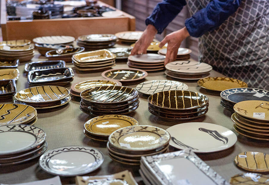茂子さんがスリップウェアに使用するのは、伝統的な丹波焼で使うものと同じ、白い化粧土と黒い化粧土。さらにその上から糠釉(ぬかぐすり)や飴釉(あめぐすり)と呼ばれる釉薬をかけることで、焼き上がりは青や黄色へと変化します。「スリップを施した丹波焼は、和食と洋食、どちらにもよく合います」と茂子さん。土地に根差した文化同士が海を渡って出合うことで、“日常の新しい美しさ”を生んだのです。