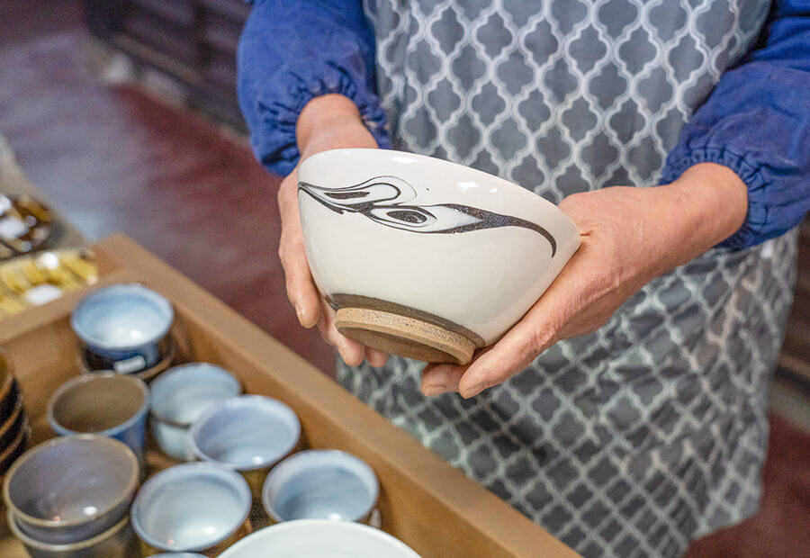 6代目が泥を使ってとっくりに万葉仮名を書いたように、小さな日常雑器に泥を使って模様を描くスリップウェア。茂子さんは直線や曲線で描く幾何学的な模様のほかに、フクロウなど動物の絵を描くこともあるそう。“自由な表現ができる”ということが、茂子さんが語るスリップウェアの魅力です。