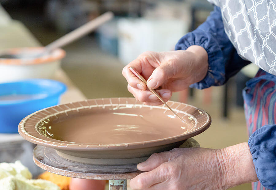 成形した器をろくろに置き、回転させながらじっと見据える茂子さん。タイミングを見てスッと泥を引いたかと思うと、あとは迷う様子もなく一心に模様を描いていく……。まさに職人技と呼ぶにふさわしい筆運びは繊細で、周りの空気が一気に緊張感に包まれるほど、ある種の崇高さを感じさせます。