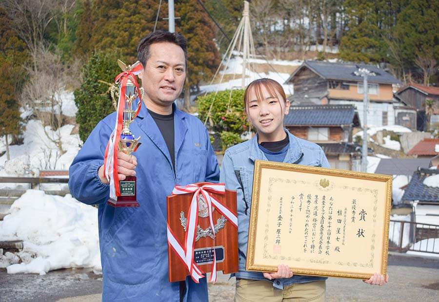 星七さんは昨年「日本学校農業クラブ全国大会」に出場し、意見発表会部門で最優秀賞ならびに農林水産大臣賞を受賞しました。全国で農業を学ぶ高校生が集い、身近な問題や今後の抱負について7分間で発表する同大会。動物嫌いから牛飼いになったストーリーを語ったスピーチで感動を呼び、日本一へと輝きました。さらには、同世代や畜産業に携わる人々に勇気と感動を与えたとして、養父市長賞も受賞しています。