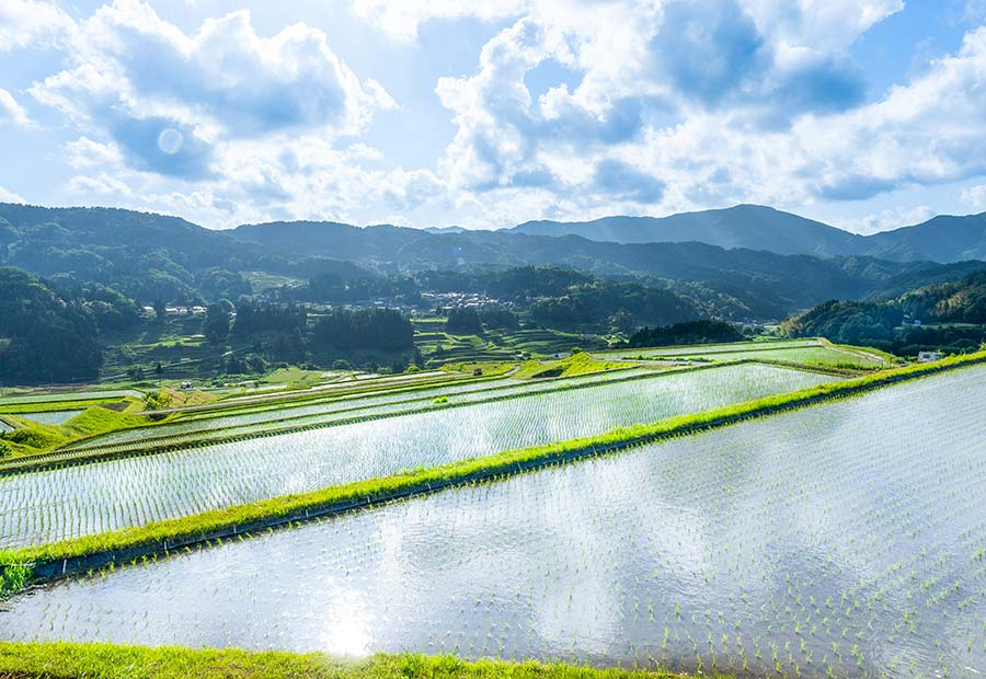 日本人にとって原風景とも言える棚田。兵庫県美方郡では、きらきらと輝く水面が折り重なるようにしてどこまでも続く、昔懐かしい棚田の風景が、今でも日常生活に溶け込んでいます。
