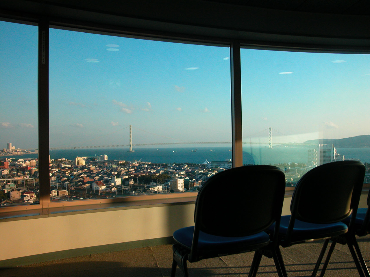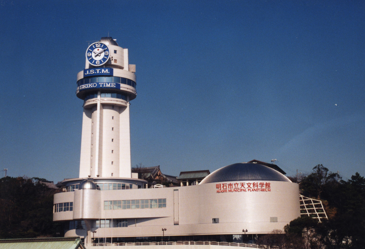 また、14階展望室からは明石海峡大橋や瀬戸内海が一望できます。東経135度日本標準時子午線上に建つ”時と宇宙の博物館”。直径約6.2mの大時計がシンボルです。