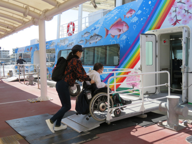 車いす利用者も乗船でき、淡路の岩屋港まで潮風を感じながらのクルーズも楽しむことができます。また、明石港を出発し、淡路島の岩屋港で折り返す約40分のミニクルーズを体験できます。(岩屋港では船内点検のため、一旦下船していただきます)
