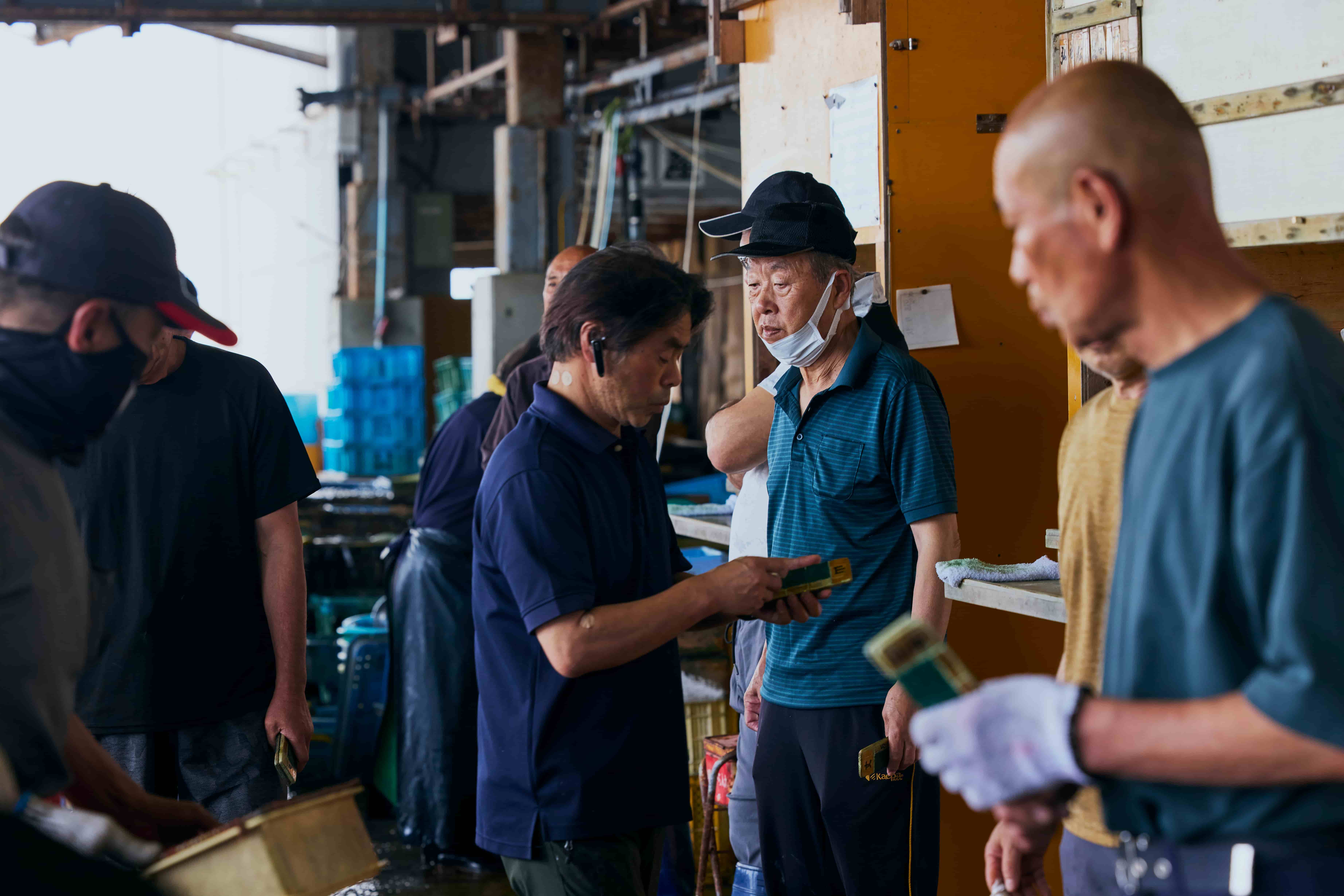 セリが始まると、漁港の空気が一変。仲買人たちが瞬時に魚の目利きをして、手のひらサイズの黒板にチョークで希望値を書いてボックスに投げ込む。最高値を付けた仲買人の名前が呼ばれると落札成功だ。1回のセリはものの30秒ほどで終了。横で見学しながらそのスピード感と緊張感を味わえる。