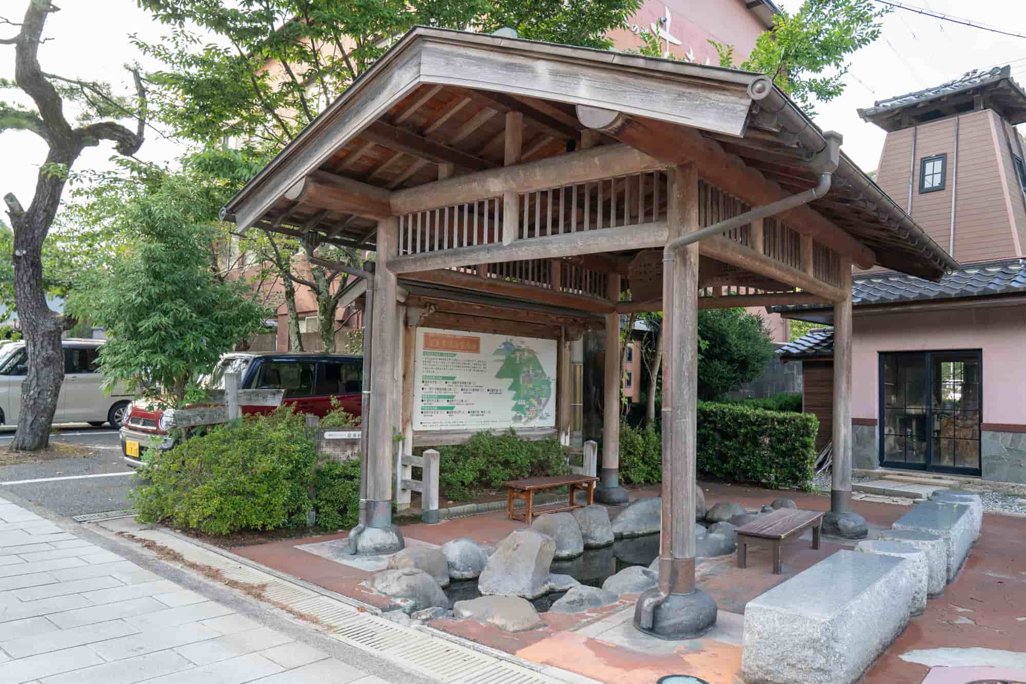 美人の湯として名高い「御所の湯」は、年間約40万人が訪れる人気の外湯。庭園風の露天風呂からは山の緑と滝が眺められ、開放感が格別だ。日帰り入浴の場合、各外湯の受付で外湯1日券(大人1500円、小人750円)を購入すれば、7つの外湯(さとの湯は休業中)が入り放題になる。