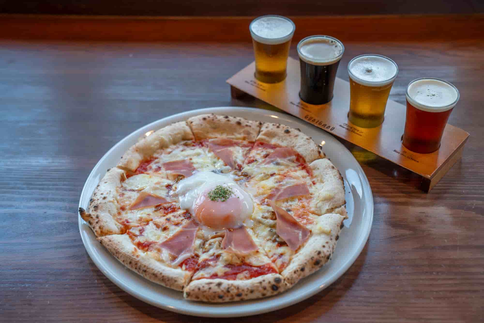 兵庫のブランド牛・但馬牛を使った「但馬牛のステーキ丼」は、ジューシーな肉の旨味を存分に堪能できる贅沢な一品。石窯で焼くピザは、温泉卵をトッピングしたビスマルクなど全8種類あり、どれもビールと相性抜群だ。