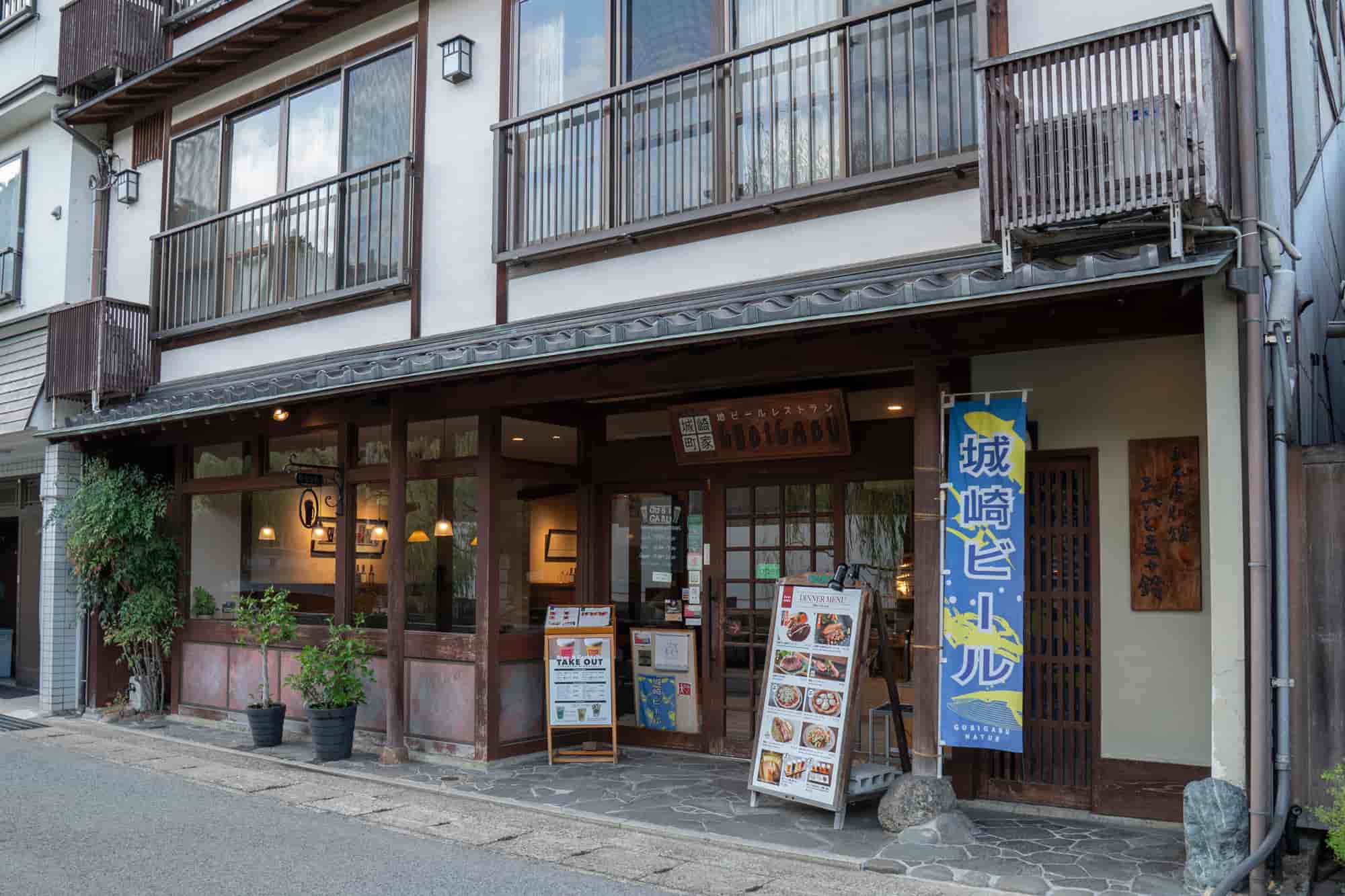 外湯めぐりの仕上げに立ち寄りたいのが、城崎温泉のメインストリートに立つ「地ビールレストランGUBIGABU」。湯上がりに浴衣のまま気軽に立ち寄れるカジュアルな雰囲気で、風情ある町並みを眺めながらクラフトビールが味わえる。