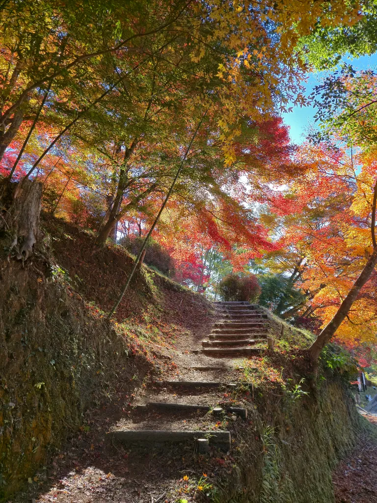 The colorful leaves, translucent in the light of the sun above my head, lighten my steps as I climb the stairs.