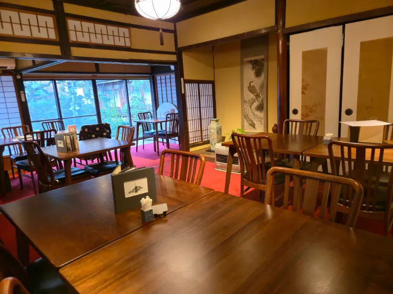 Oimatsu Dining, housed in a renovated building designated as an Hyogo Prefecture Important Cultural Property for Landscape Development. The sight of the garden from the windows is like the perfect interior design that completes the architecture.
