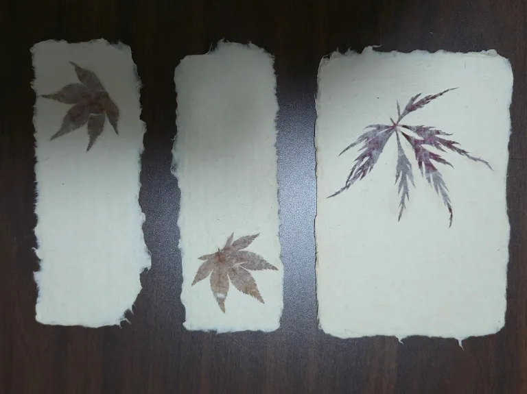 My creations were dried in the sun and delivered to my home about a week later. I was surprised to see the pattern that emerged on the cardboard (lol). Out of my creations, I will send the postcard to my family in South Korea together with photos of Shiso. The smooth, yet sturdy washi seems to speak of the purity and strength of the nature of Shiso.