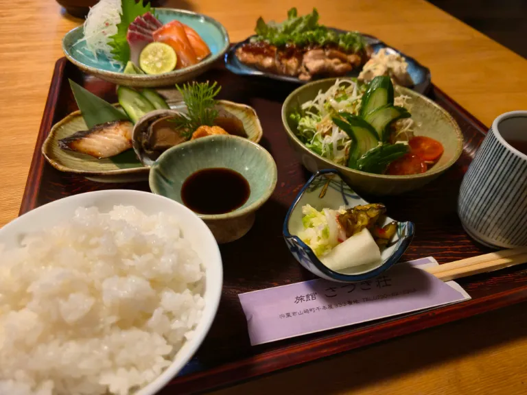 The dinner menu includes new rice, fresh vegetables, chicken topped with yuzu miso, sashimi, grilled fish, asari clam soup, and much more. The owner's home-grown rice, Hinohikari, has a sparkling appearance and a soft, chewy texture. The chicken with yuzu miso made the rice even more appetizing. The vegetables and yuzu miso are also home-made