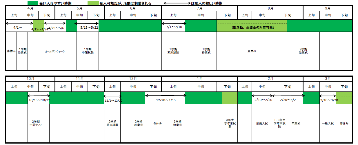 学校行事(定期考査、文化祭、体育祭、入試期間等)により受け入れが難しい時期があります。