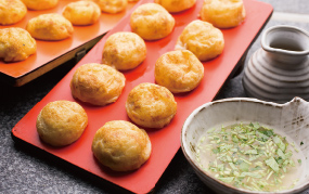 玉子をたっぷり使った生地とタコを専用の銅鍋で焼き、だしをつけていただきます。