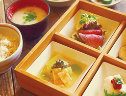 播磨地域の野菜をふんだんに使った弁当は四季で内容が変わり、4種の前菜、豆腐、粕汁、季節のご飯、香の物がセット。13時30分からのカフェタイムでは「こうじアイス」「酒まんじゅう」など自家製スイーツが人気です。