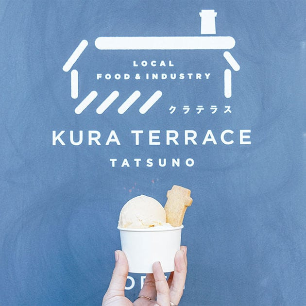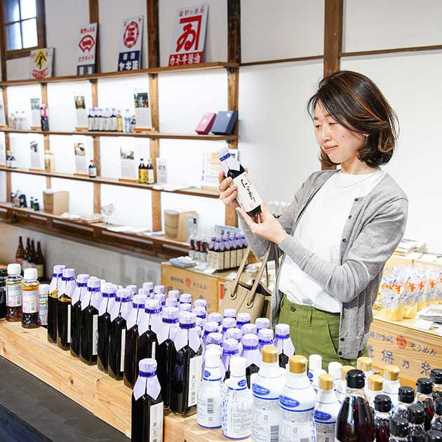 醤油蔵を改修して建てられたアンテナショップ「クラテラスたつの」では、多彩な醤油製品を販売。甘じょっぱさがクセになる醤油ジェラートも味わえます。