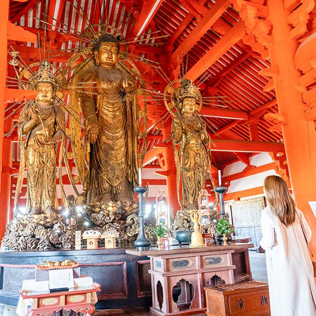 鎌倉時代初期に建立された「浄土寺」。国宝・浄土堂内にある高さ約5.3メートルもの阿弥陀三尊立像に注目を。西日が射しこむと、ご来迎のような荘厳な雰囲気に包まれます。