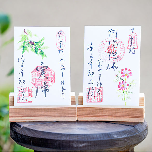 塔頭の歓喜院には、美しい旬の花が描かれた月替わりのご朱印や、副住職手作りの「おみくじ人形」など、心惹かれる授与品も。阿弥陀仏をイメージした『あみださん』や『ほとけの子』、『福猫・福犬』など、おみくじ人形はそれぞれ表情が異なり、季節によってさまざまなバリエーションで登場します。