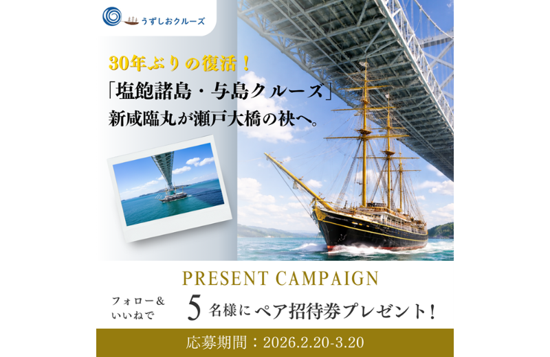 2026年5月23日(土)・24日(日)の2日間、与島パーキングエリアで開催される「せとうち島旅フェス2026」に合わせ、「塩飽諸島・与島クルーズ」を開催いたします。かつて与島を周遊していた「咸臨丸」航路から30年。その歴史を受け継ぎ、最新の「咸臨丸」が与島発着の特別航路で復活いたします。巨大な瀬戸大橋を真下から仰ぎ見る迫力の景観と、日本初の太平洋横断を支えた“塩飽(しわく)の水夫(かこ)”の歴史を巡ります。