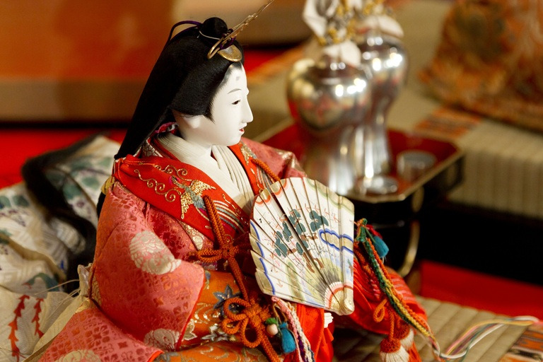 福岡筑豊で炭鉱業を興隆させて一時代を画した「筑豊の御三家」の一つ、貝島家所蔵の雛人形展を開催。「高宮貝島本家」三代目当主貝島孝氏が長女禮子氏の初節句にあたり、京都の老舗人形店丸屋(現・丸平大木人形店)に製作を依頼。五世大木平藏氏の手により昭和十五年に出来上がった人形は十五人揃いの華やかな雛飾りで、雛道具も屏風などの室礼の道具から、前飾り、化粧道具、御籠、御所車に至るまで家紋散らしの別誂品です。