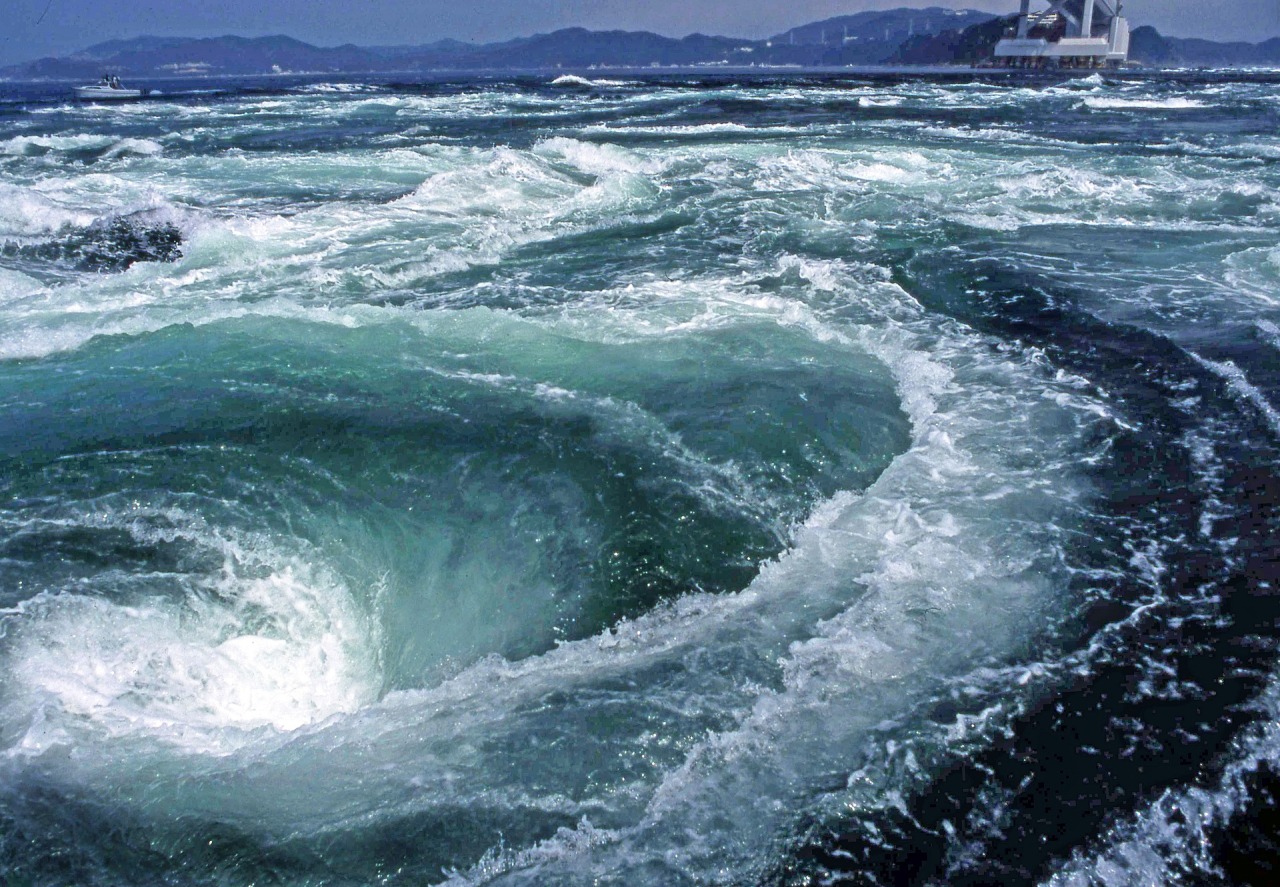 瀬⼾内海と太平洋が出あう鳴門海峡では、⼲満差が海⾯に⾼低差を⽣み、潮流が独特の地形の海峡へ激しく流れ込むことで渦潮が⽣じます。
