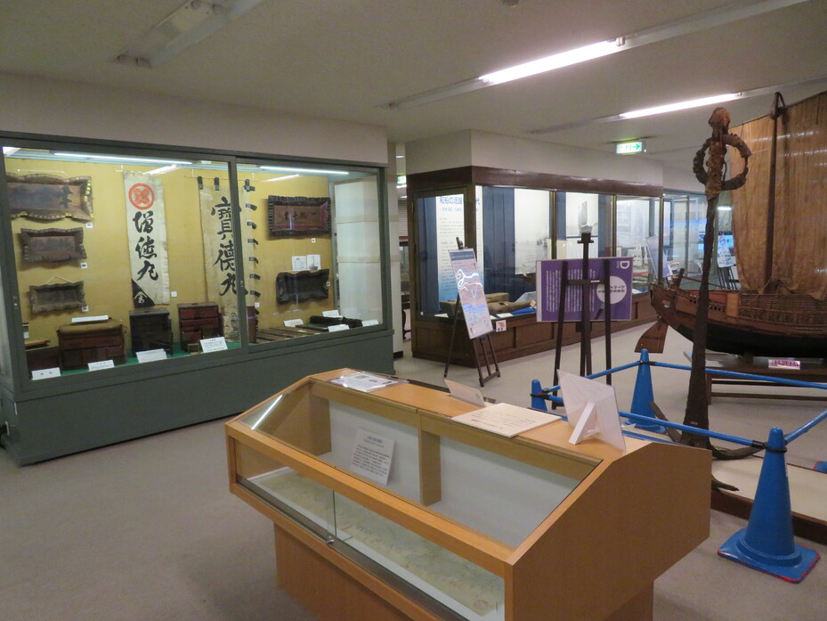 | 所要時間 | 江戸時代後期に日本海や瀬戸内海で活躍した北前船、樽廻船などの和船模型及び海路図・航海図などを中心に、西洋型帆船模型、汽船模型、レシプロ機関模型、絵馬、屏風、引札、船だんす、船板図、船大工道具、航海用器具、航海書、文献類など多岐にわたる所蔵品を視察する。 |