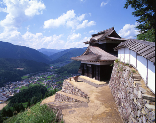 城山の山頂にあり、眼下に町並みをぐるっと見渡せます。山頂までは遊歩道があり城跡まで行ける。夜にはライトアップされ、幻想的な姿を見せます。