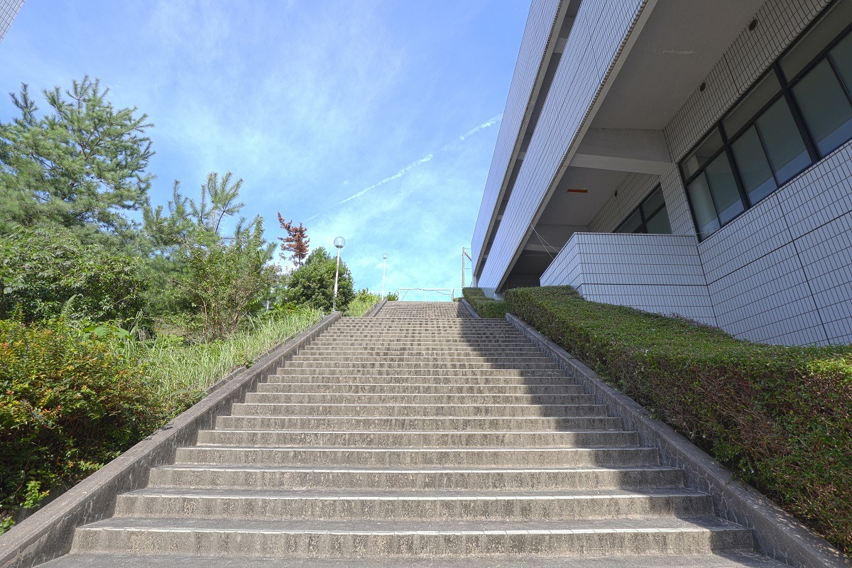 また大学構内にアップダウンが多いため階段が多く、山の緑や空もすぐ近くに迫っています。校舎内以上に、大学構内の風景に、映像的にも魅力的なポイントが多数存在すると思っています。