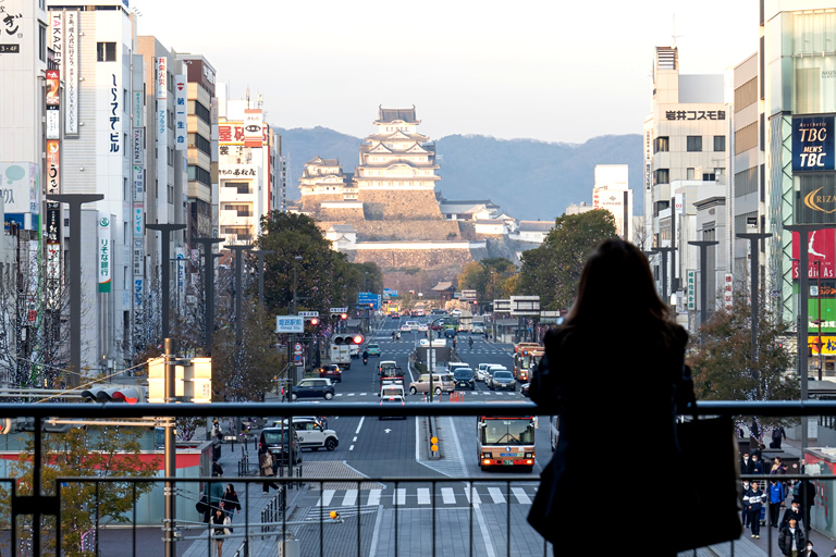 JRの姫路駅を降りたら、北口にある眺望デッキ、通称キャッスルビューへ。その名の通り、駅前からまっすぐに延びる大手前通りのむこうに姫路城を眺められるので、ぜひ立ち寄りたい。そして、にぎやかなみゆき通り商店街を通り抜けて20分ほど歩くと、姫路城にたどりつく。